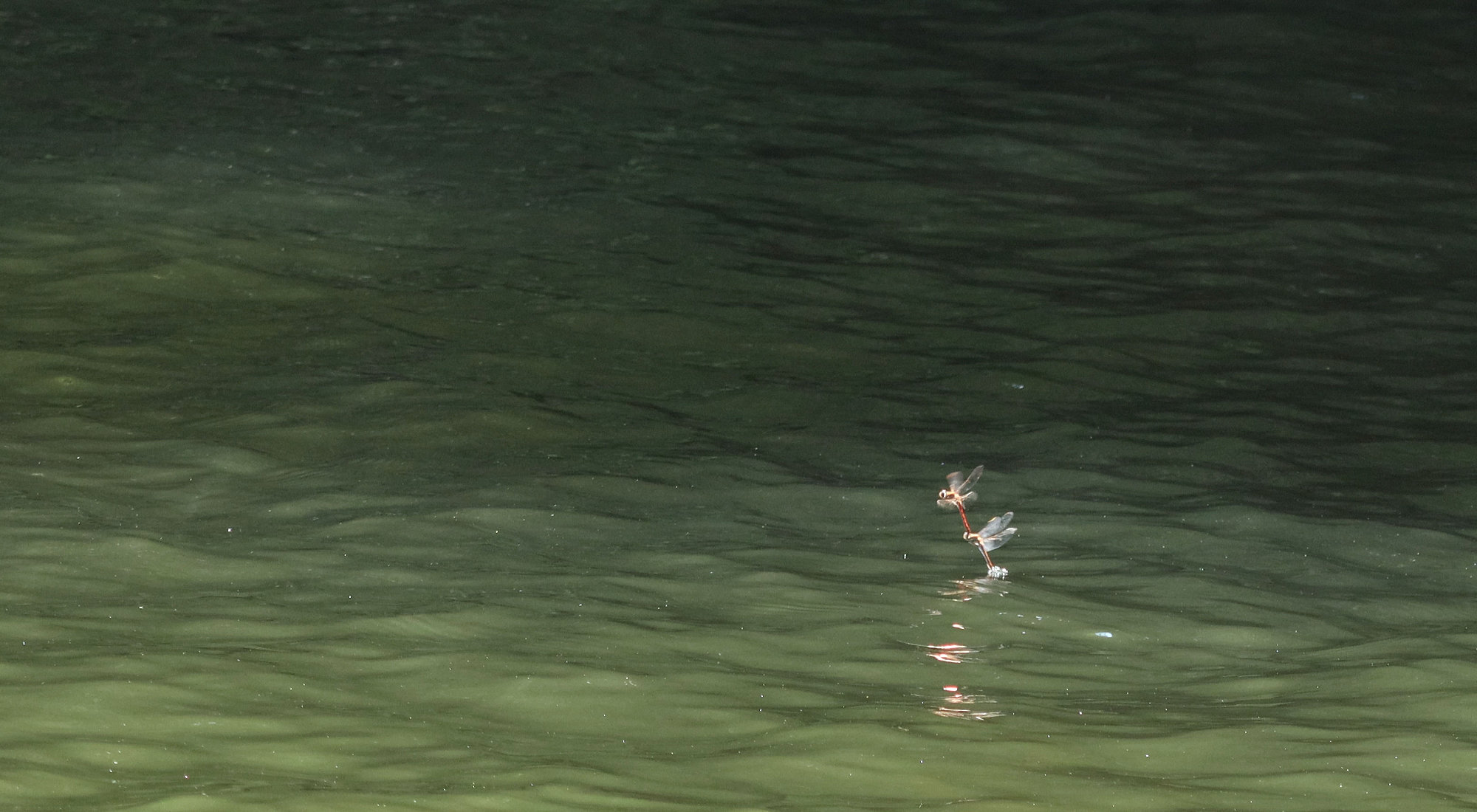Tags Insects I've never noticed this before. The upper dragonfly was dipping his partner into the water every 6 inches, or so. I presume that this activity was the eggs getting laid.