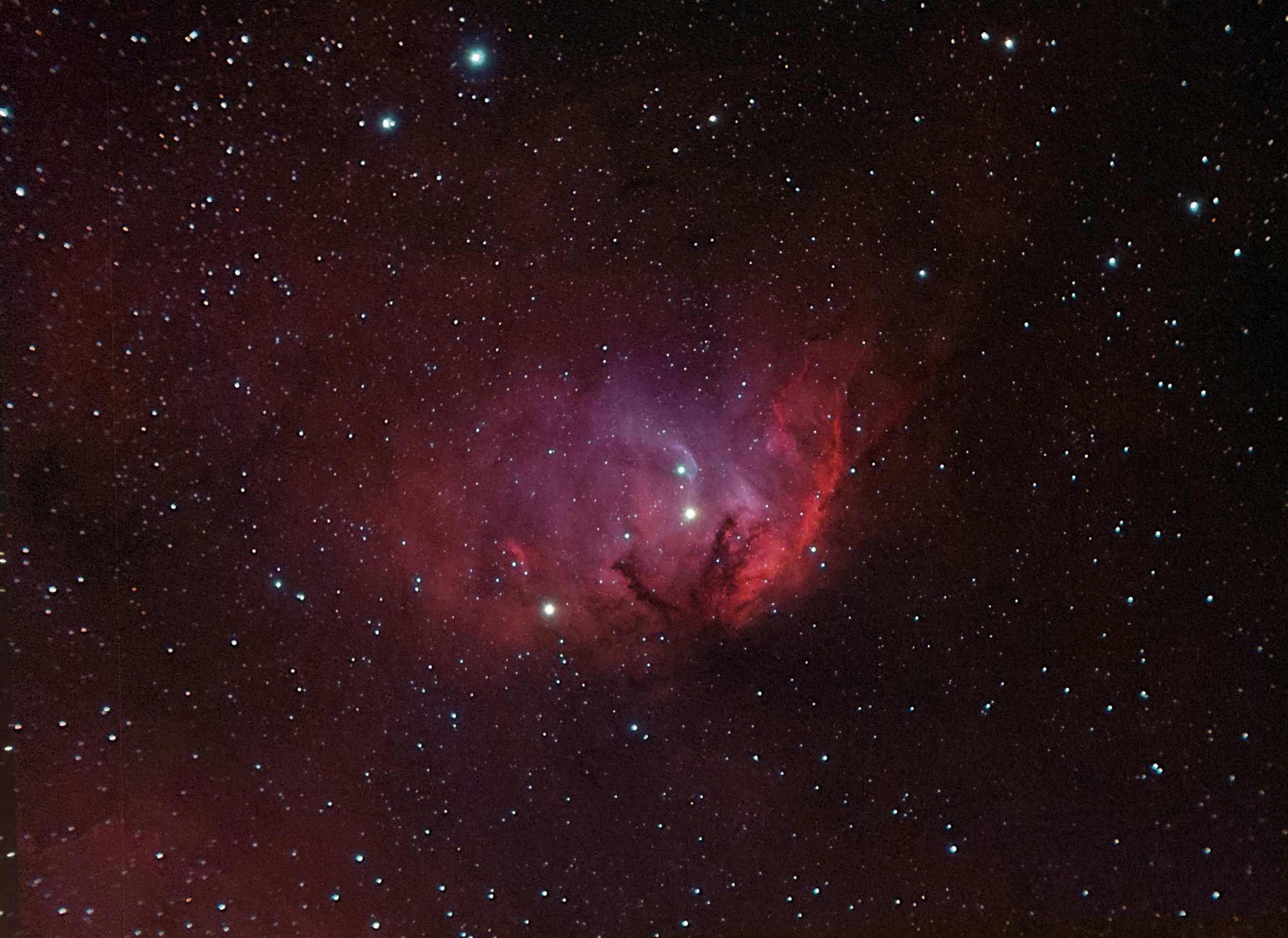 Sharpless 101 is known as the Tulip Nebula. It is located in Cygnus, not far from the Crescent Nebula. I've shown both this image, and a wider field, in Cartes du Ciel to give an indication of their proximity. In this image I have mapped Ha to Red and OIII to Blue, and to a lesser extent, to Green. I also shot some Red, Green and Blue for the stars.